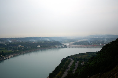 下面這一張照片其實就是石門水庫的真面目,但是在拍這張照片的時候其實有一個刻骨銘心的故事。因為一開始我不知道石門水庫,其實是有上下兩個落差蓄水池的,上方的就是下面這張有著自然地形的水庫;在下方還有一個比較類似第二段蓄水以及攔砂壩的後池。故事是這樣的,因為我平常比較喜歡"晚一點"出遊,所以很多功課都是出門前大約二十分鐘做的,而且還要扣掉在路線的規劃時間。當到了石門水庫的收費亭時,繳完費很快的看到右方有一個很大的水池,一下子就給他衝進去停好車,直到看到了洩洪道,才知道原來上方才是本尊的石門水庫。後來看到一個洩洪道旁邊的樓梯,直覺就走了上去;沒想到走了上去,是這陣子所犯的最大錯誤之一。先不提走上去心跳接近200下的事情(體力真爛,又要體檢了,邊爬上去的時候一直想的是之前的內定內政部長忽然休克的那一件事,囧rz)